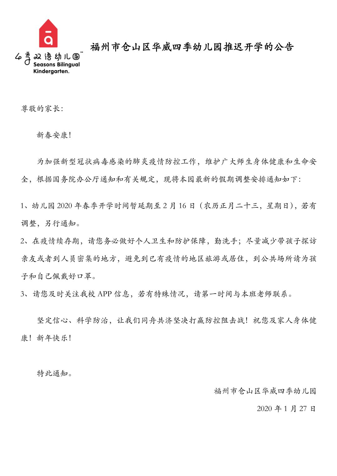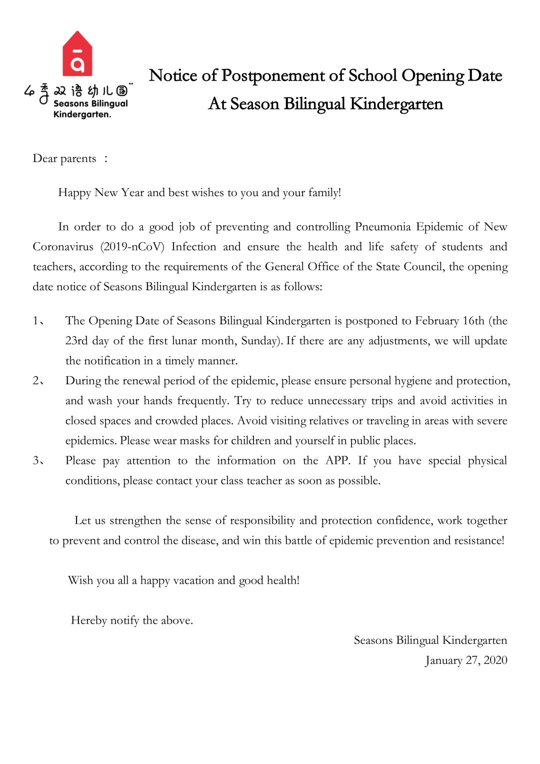 華威四季雙語幼兒園積極響應教育廳相關規定,積極落實抗擊防范疫情工作,為保障全園師生健康安全,我園將2020 年春(chun)季開學時間暫延期至 2 月 16 日(ri)(農歷正月二十三,星(xing)期日(ri)),若(ruo)有調(diao)整,另行通知(zhi)!