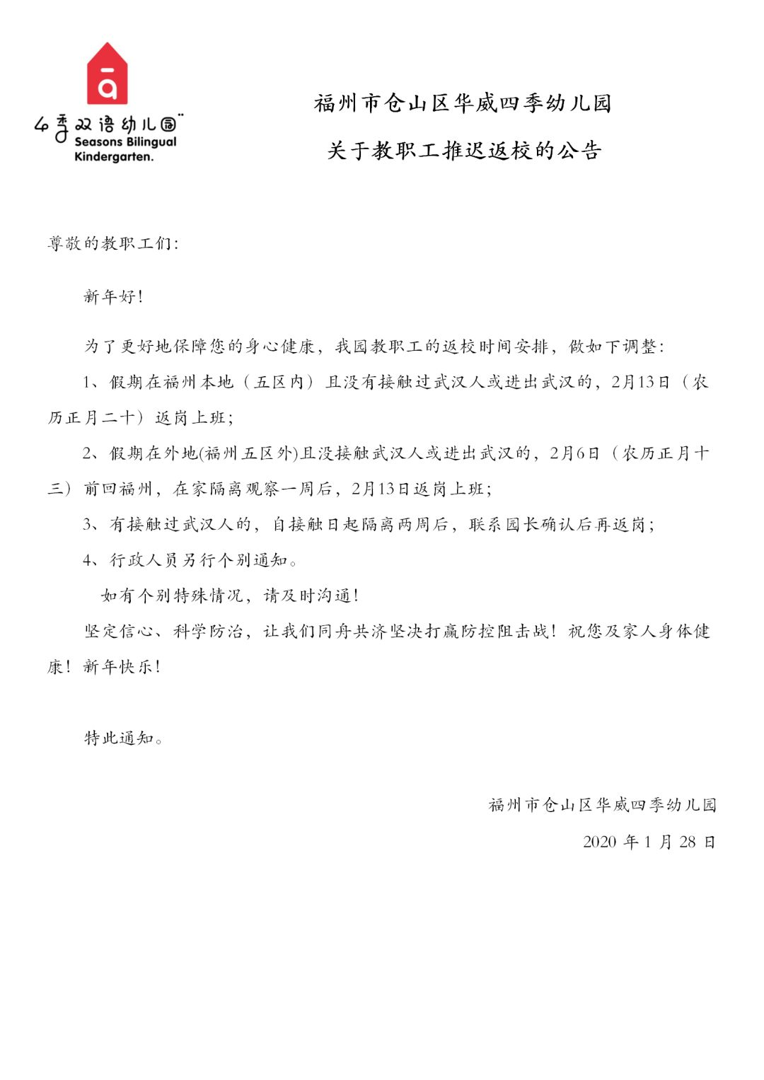 我園幼(you)兒及教職工推遲開(kai)學(xue)、返崗(gang)的公告如下▼