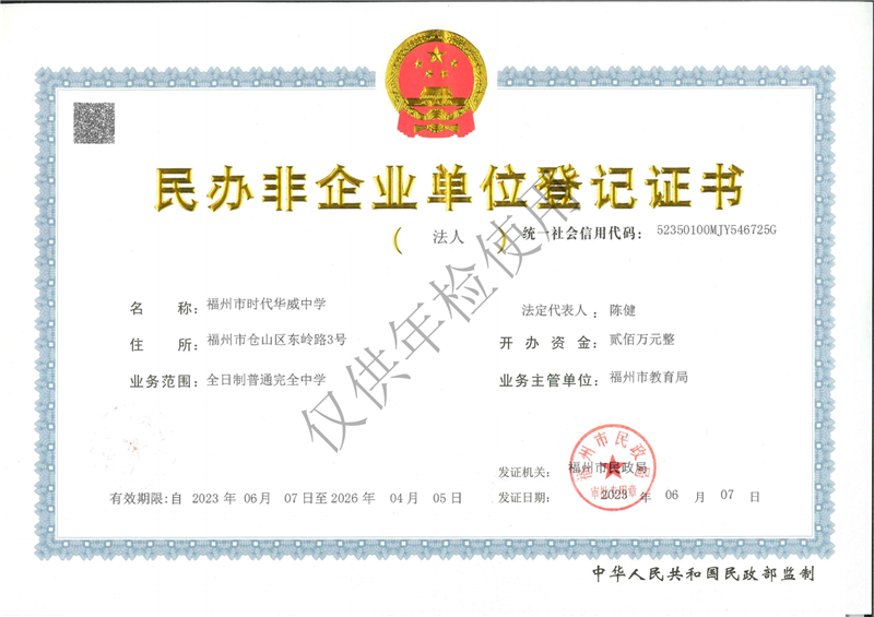 福州時代華威中學民非企證書公示