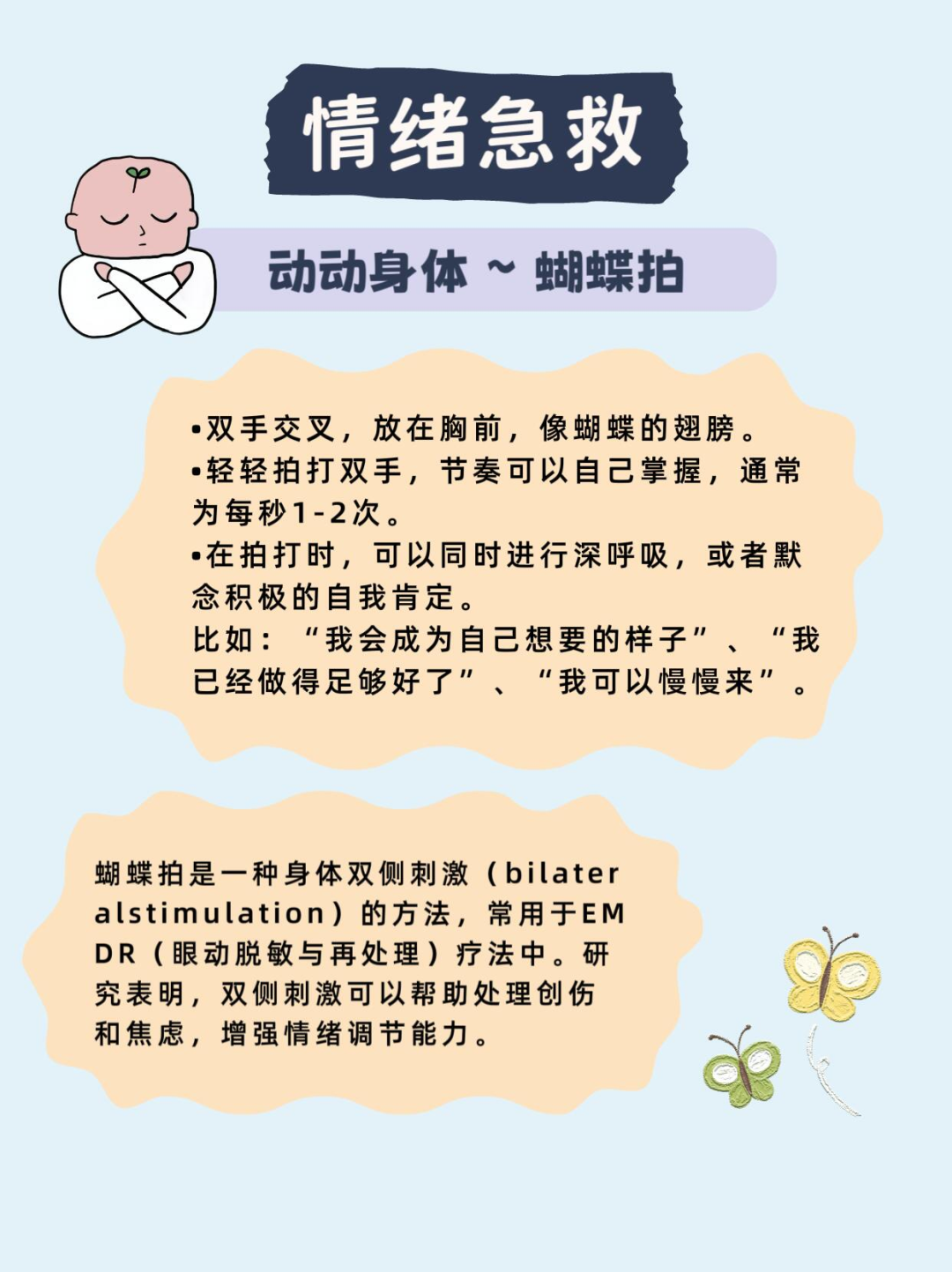 雙臂交(jiao)叉抱在(zai)胸前,像(xiang)擁抱嬰(ying)兒一樣(yang),輕(qing)輕(qing)拍打上臂,速度慢(man)且以感覺(jue)舒適(shi)為(wei)主。