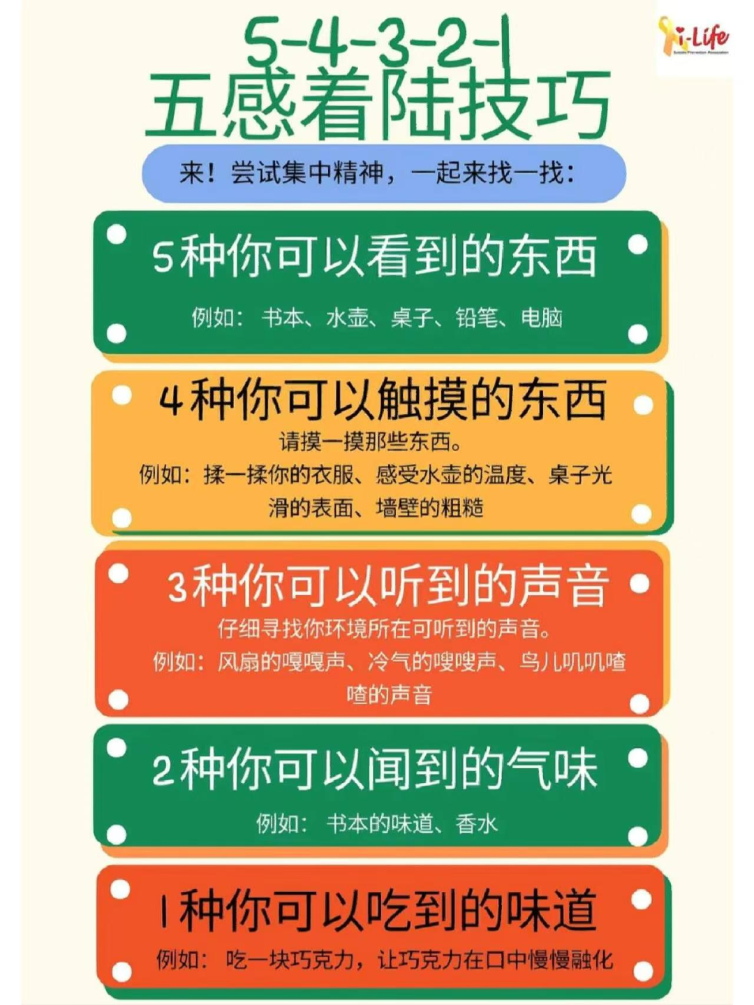 54321情緒著陸(lu)技術旨在幫(bang)助個體(ti)旨在通過集中(zhong)注意(yi)力在周圍環境的具體(ti)細節上,幫(bang)助自己(ji)從負面的情緒中(zhong)慢(man)慢(man)抽離,離開(kai)“那時那刻”,而將注意(yi)力更多地關注到自己(ji)的“此時此刻”。